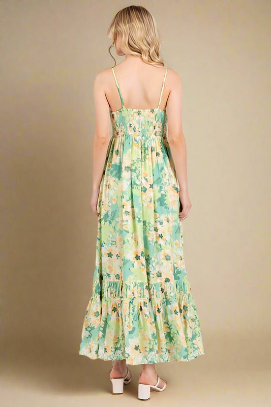 Blue & Green Floral Tiered Chiffon Maxi Dress