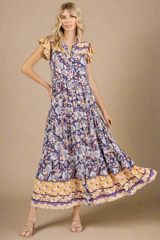 Blue Mixed Floral Ruffle Maxi Dress
