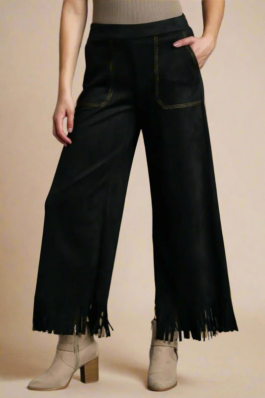 Black Vegan Suede Wide Leg Pants Fringe Hem