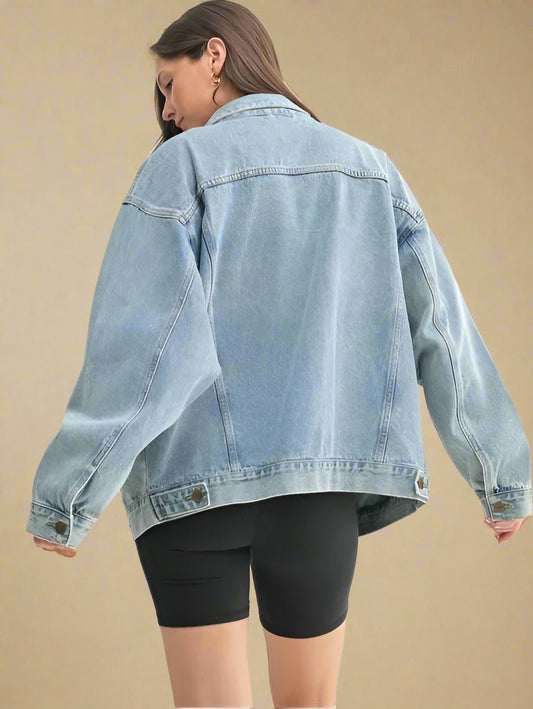 Medium Wash Distressed Button Up Long Sleeve Denim Jacket