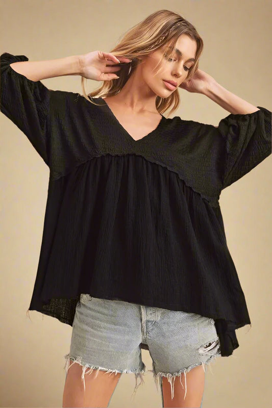 Textured Striped Popover Top – Soft Blue & Lemon Cream