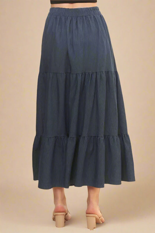 Mint Floral Print Denim Maxi Skirt with Front Slit