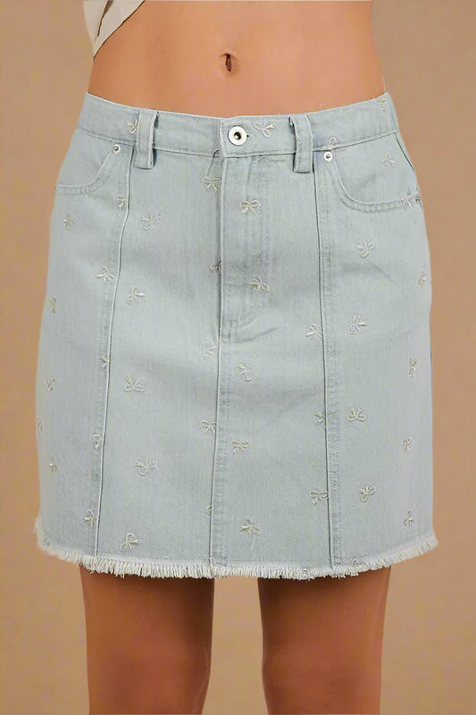 Light Wash Denim Mini Skirt with Embroidered Bows