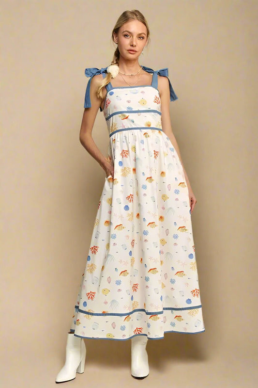 Abstract Print Maxi Dress – Blue & White with Red Trim
