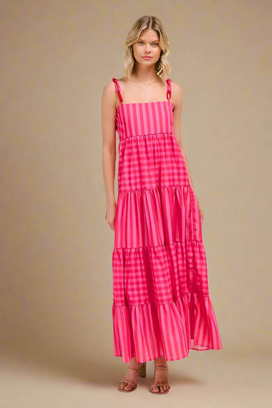 Colorblock Tiered Maxi Dress in Fuchsia & Tangerine
