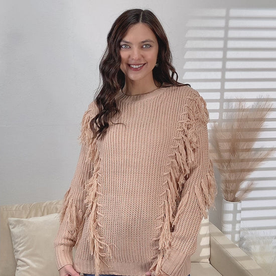 Este suéter Dusty Pink es perfecto para un look divertido y relajado. Con su tejido elástico y sus exclusivos detalles de borlas, es cómodo y elegante. Añade un toque divertido a tu guardarropa con este acogedor suéter de manga larga.