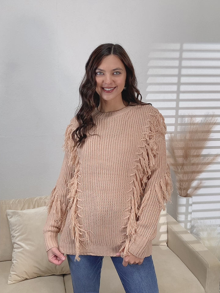 Suéter de manga larga con detalle de borlas en rosa polvoriento