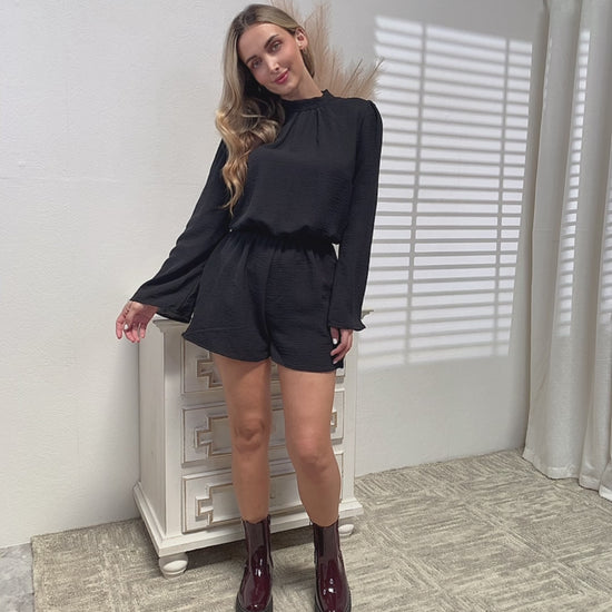 ¡Este mono será la estrella de tu guardarropa! Tiene cuello alto y cintura elástica para mayor comodidad, además de mangas largas acampanadas para darle un toque de dramatismo. Además, tiene bolsillos para mayor practicidad. Disponible en negro y tallas grandes. ¡Muestra tu estilo divertido con el mono con espalda abierta!