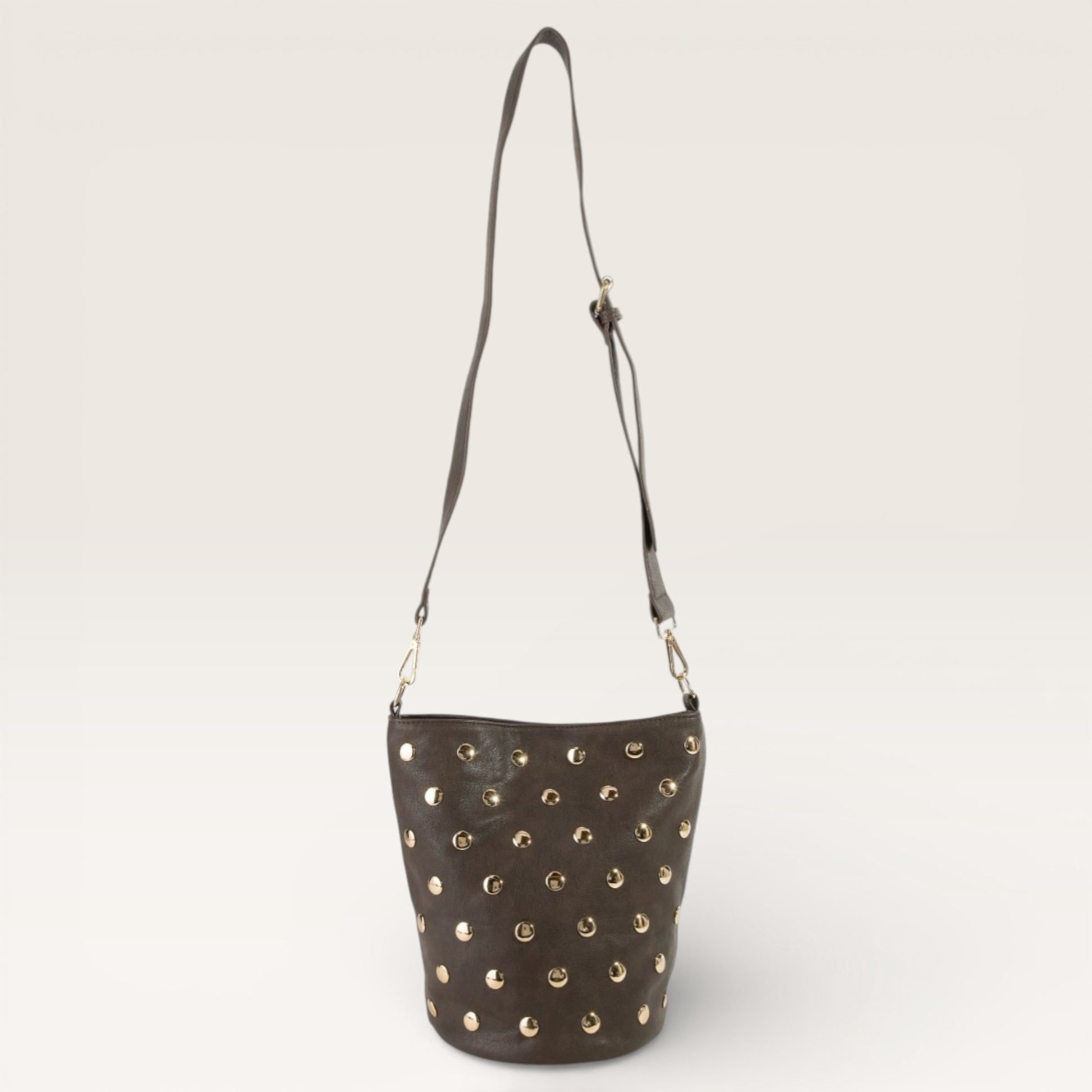 Meet your new go-anywhere bag. This vegan leather bucket is dressed up with statement studs and ready for whatever you throw at it. Rock it on your shoulder for a polished vibe or sling it crossbody when you need your hands free. Roomy, durable, and totally animal-friendly—because the best accessories don't compromise on style or values.