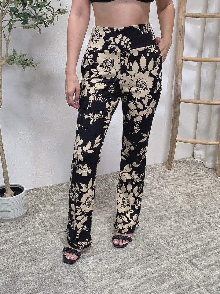 Estos pantalones acampanados florales de cintura alta presentan hermosos detalles en color topo y negro, que realzan cualquier look con el que se combinen. Con su ajuste favorecedor y su patrón atrevido, estos pantalones son perfectos para cualquier ocasión informal.