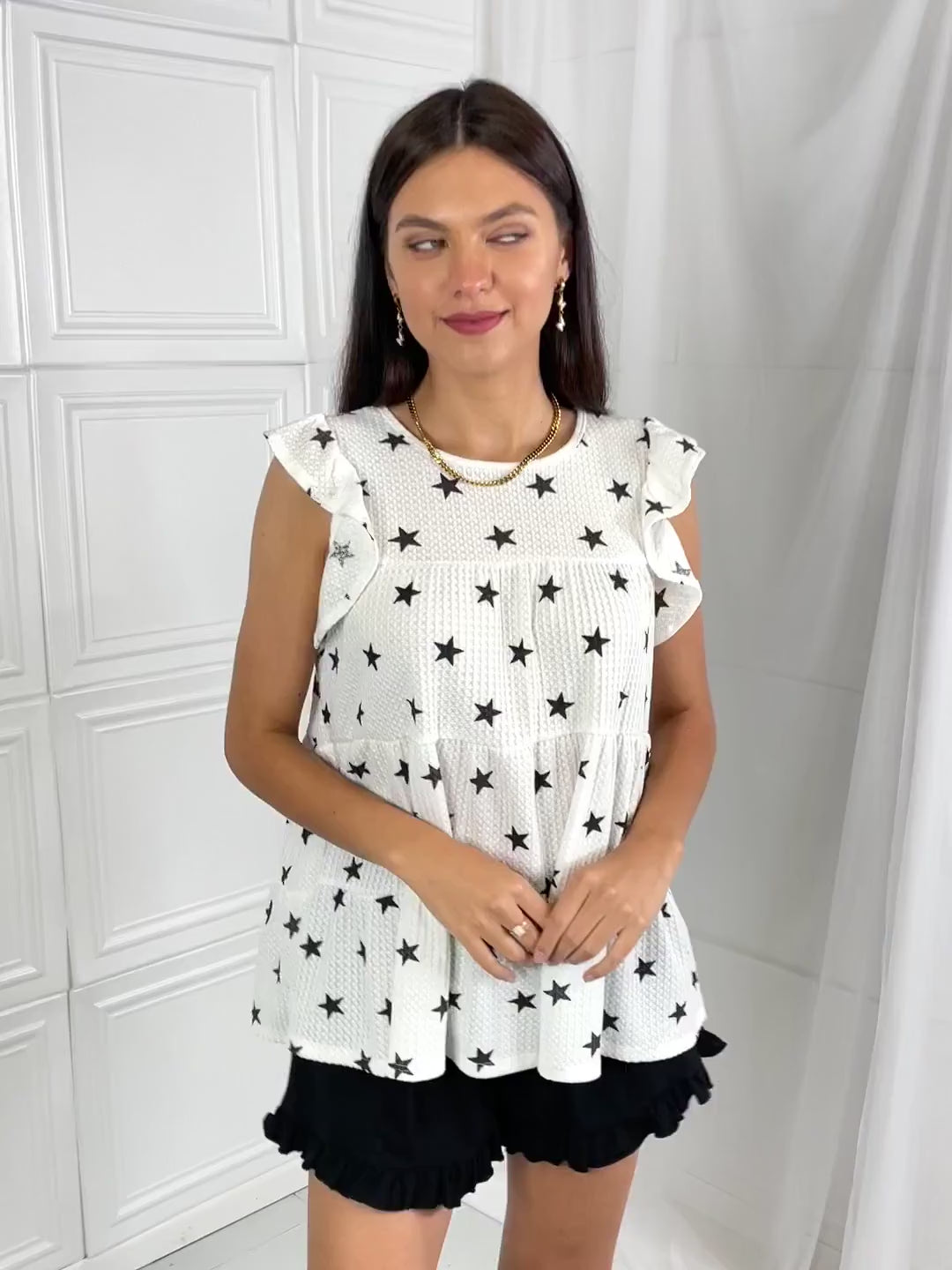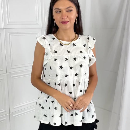 ¡Saca a relucir tu lado más juguetón con este top babydoll con estampado de estrellas! Con sus mangas de mariposa y su talle ajustable, puedes lucir un look cómodo y elegante. Perfecto para cualquier ocasión informal. Advertencia: ¡puede provocar un exceso de giros y cumplidos!