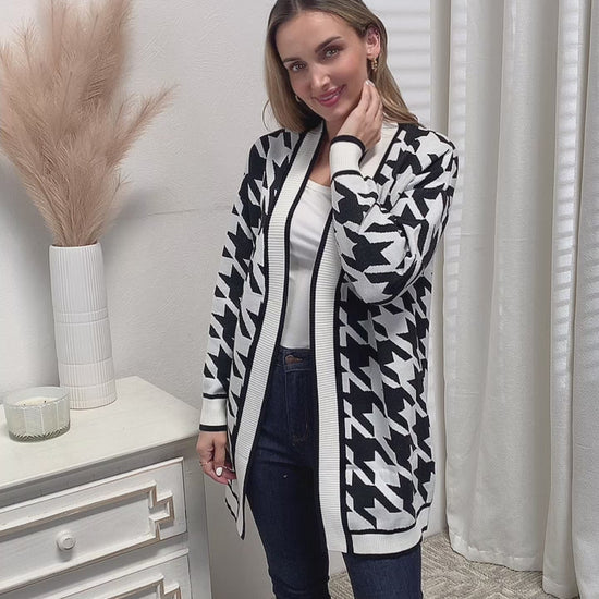 Cárdigan largo con parte delantera abierta y estampado pata de gallo en blanco y negro