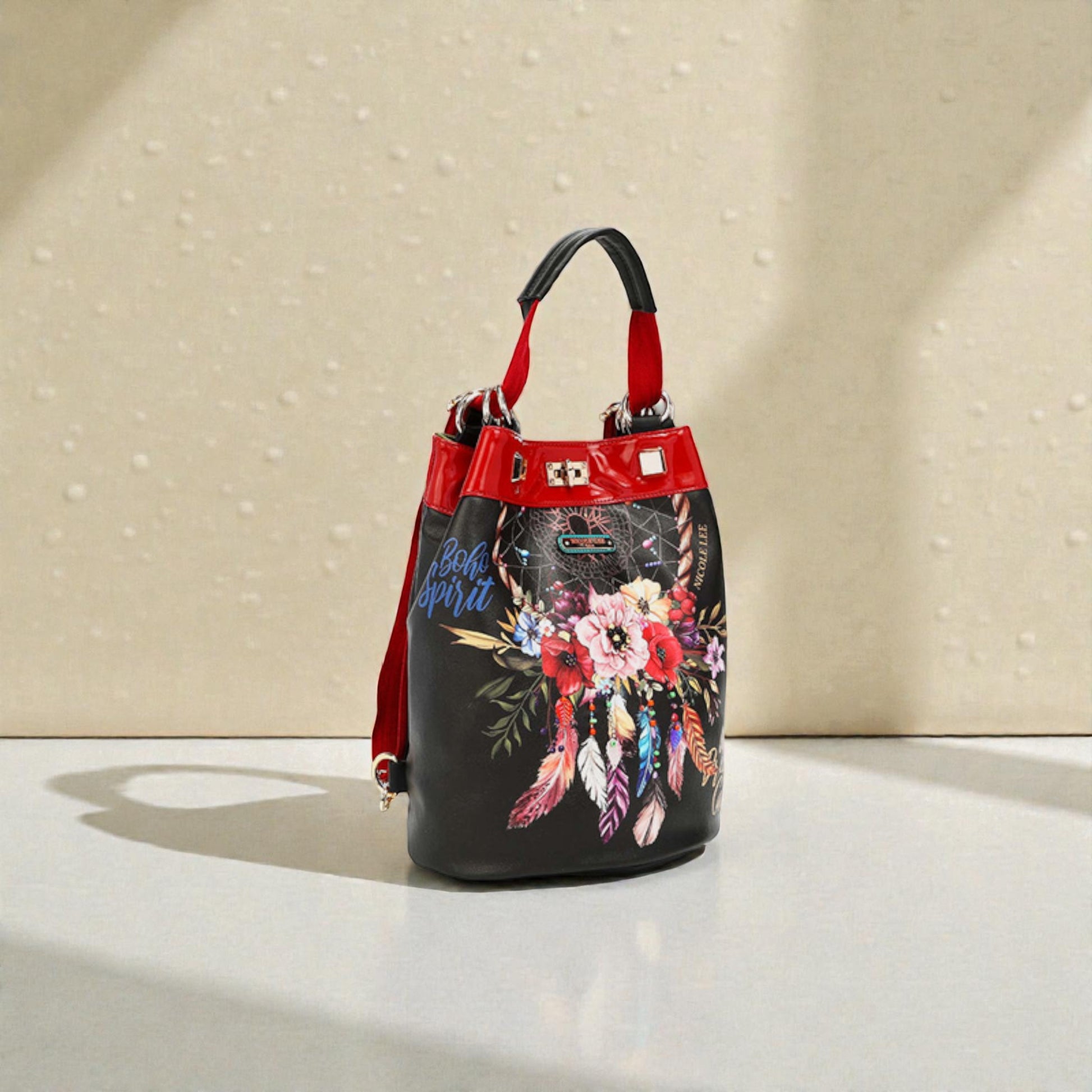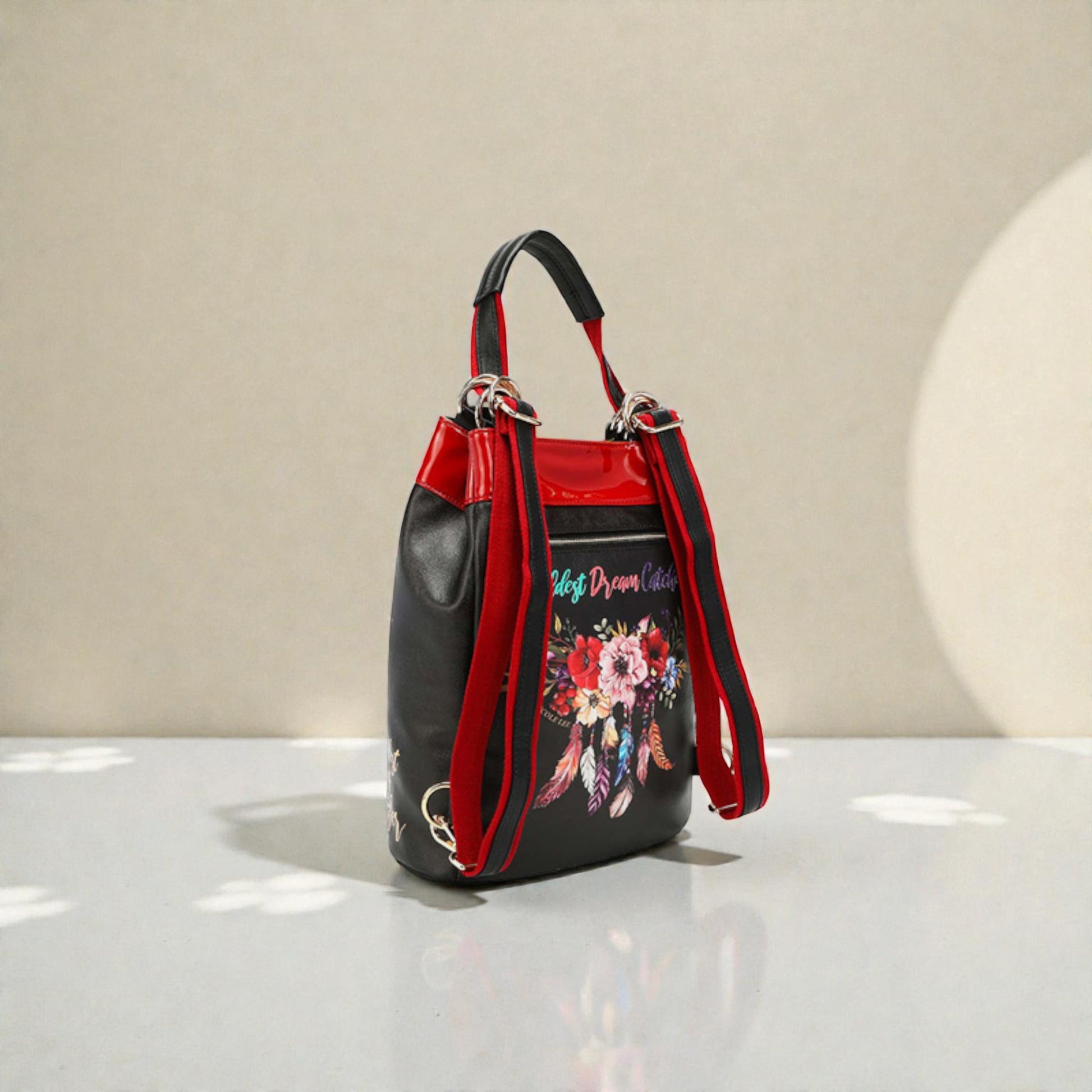 Mochila bohemia de piel vegana con diseño floral en color negro