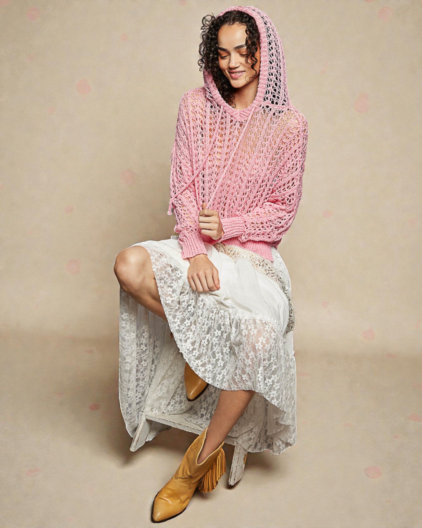 Wrap yourself in cozy charm with this rose pink crochet hooded sweater. Crafted with delicate openwork details, the long sleeves provide warmth while the relaxed fit keeps things effortlessly comfortable. The attached hood adds a playful touch perfect for layering or standalone wear.