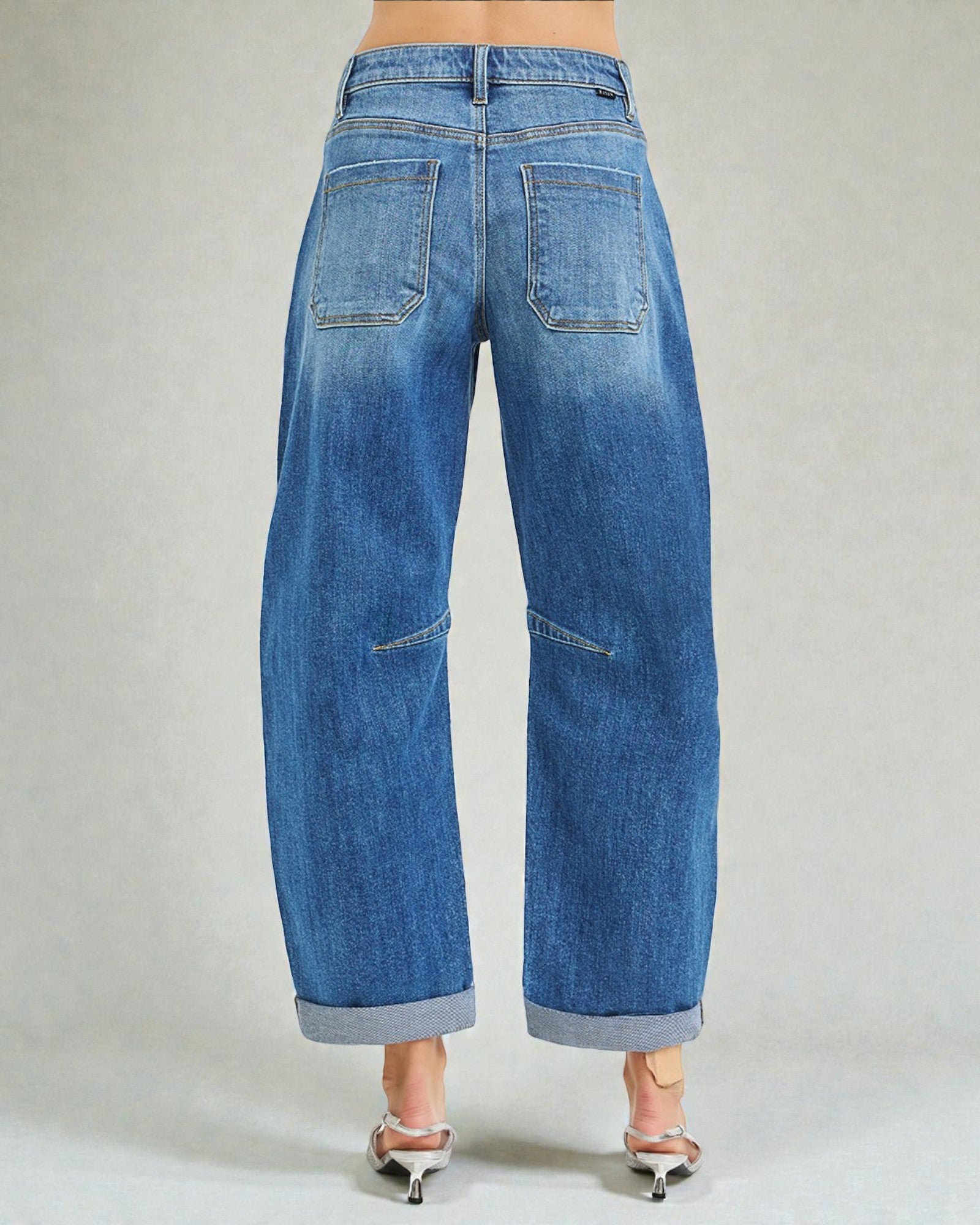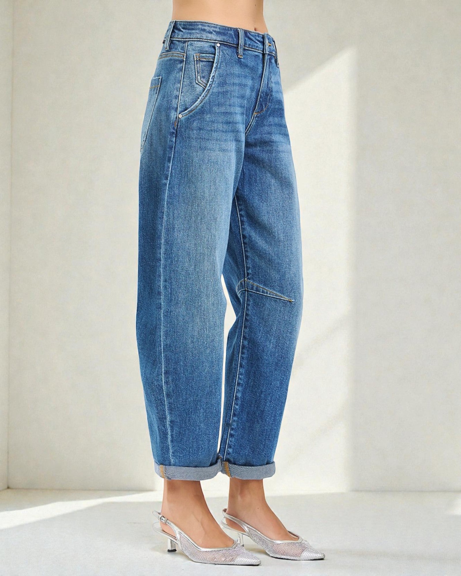 These barrel leg jeans bring effortless cool to your everyday rotation. Crafted from a soft cotton blend with just enough stretch to move with you, they feature a relaxed silhouette that hits at the ankle with a crisp cuffed hem. The medium wash keeps things versatile—pair them with anything from oversized tees to fitted tops.
