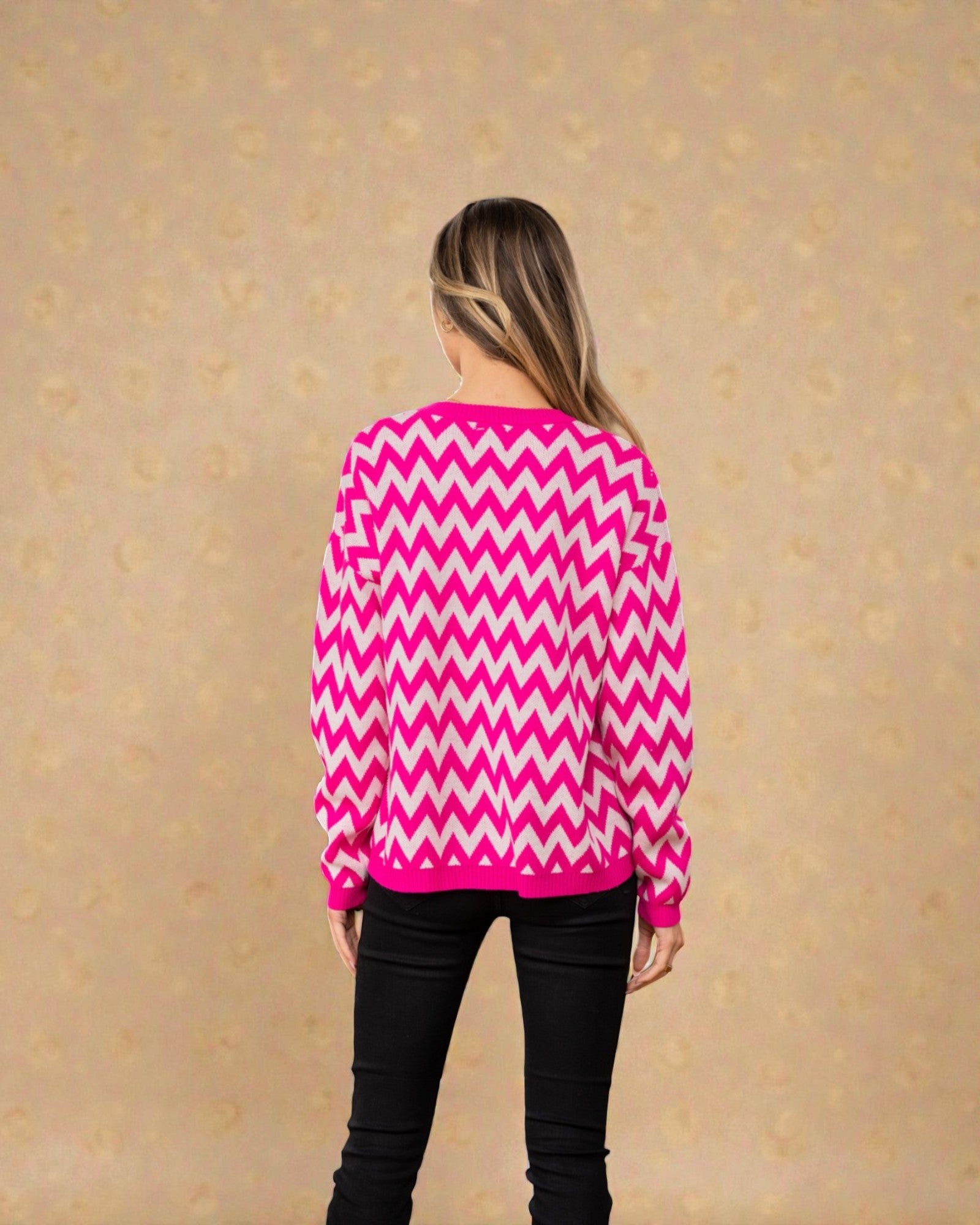 Suéter de manga larga con rayas onduladas en contraste en color marfil fucsia