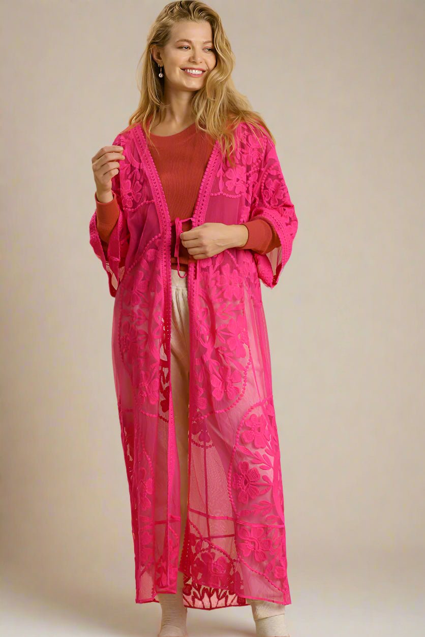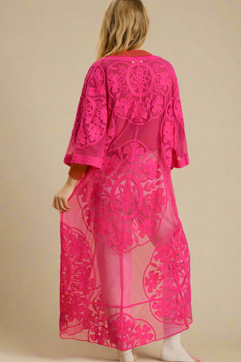 Introducing the ultimate duster kimono - the Hot Pink Embroidered Mesh Duster Kimono. Made of a soft cotton blend, this kimono is perfect for any weather and is available in plus sizes. Show off your style and stand out in the crowd with this piece!