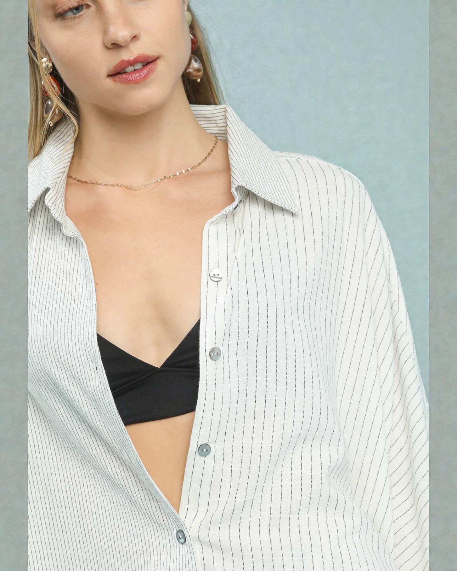 Effortless elegance meets everyday comfort in this breezy linen blend button-up. The soft ivory and sage pinstripe pattern brings subtle sophistication, while the relaxed fit and three-quarter sleeves make it perfect for layering or wearing solo.