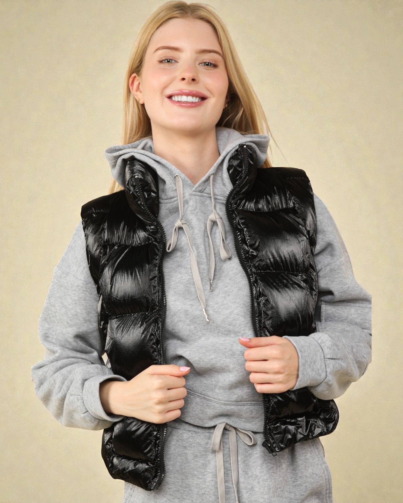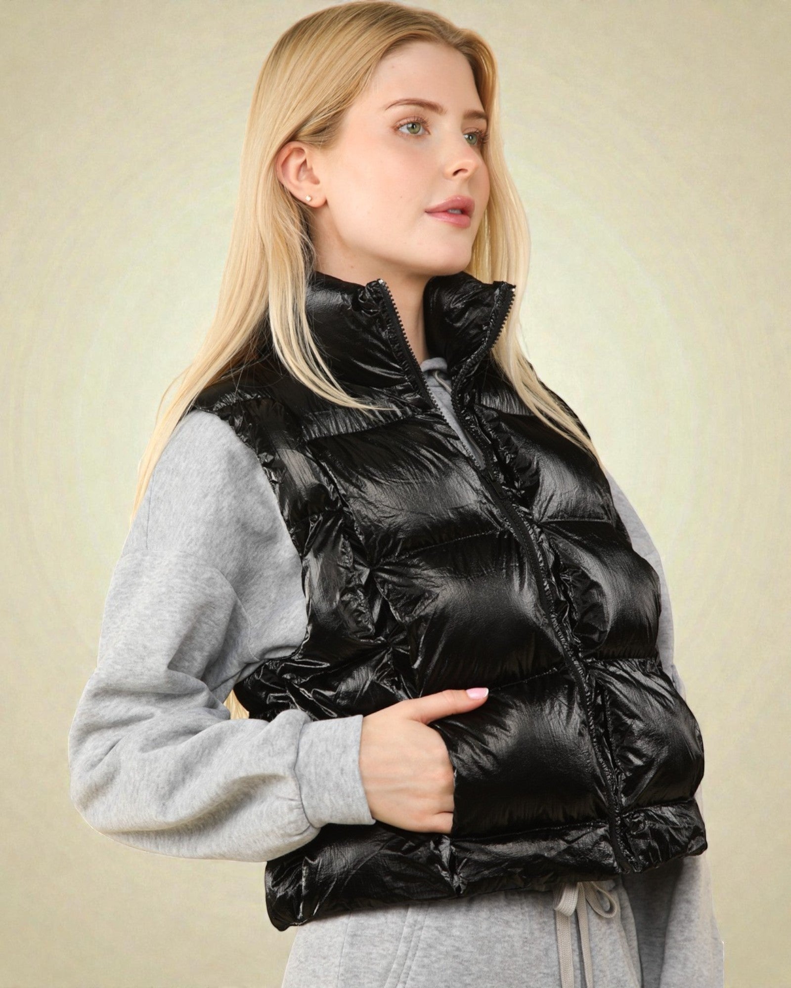 ¡Manténgase abrigado y con estilo con nuestro chaleco acolchado con cremallera y acabado metalizado brillante en negro! Con bolsillos para mantener las manos abrigadas y un diseño de ropa de abrigo, estará listo para cualquier aventura. Perfecto para agregar un poco de brillo a su guardarropa de invierno.