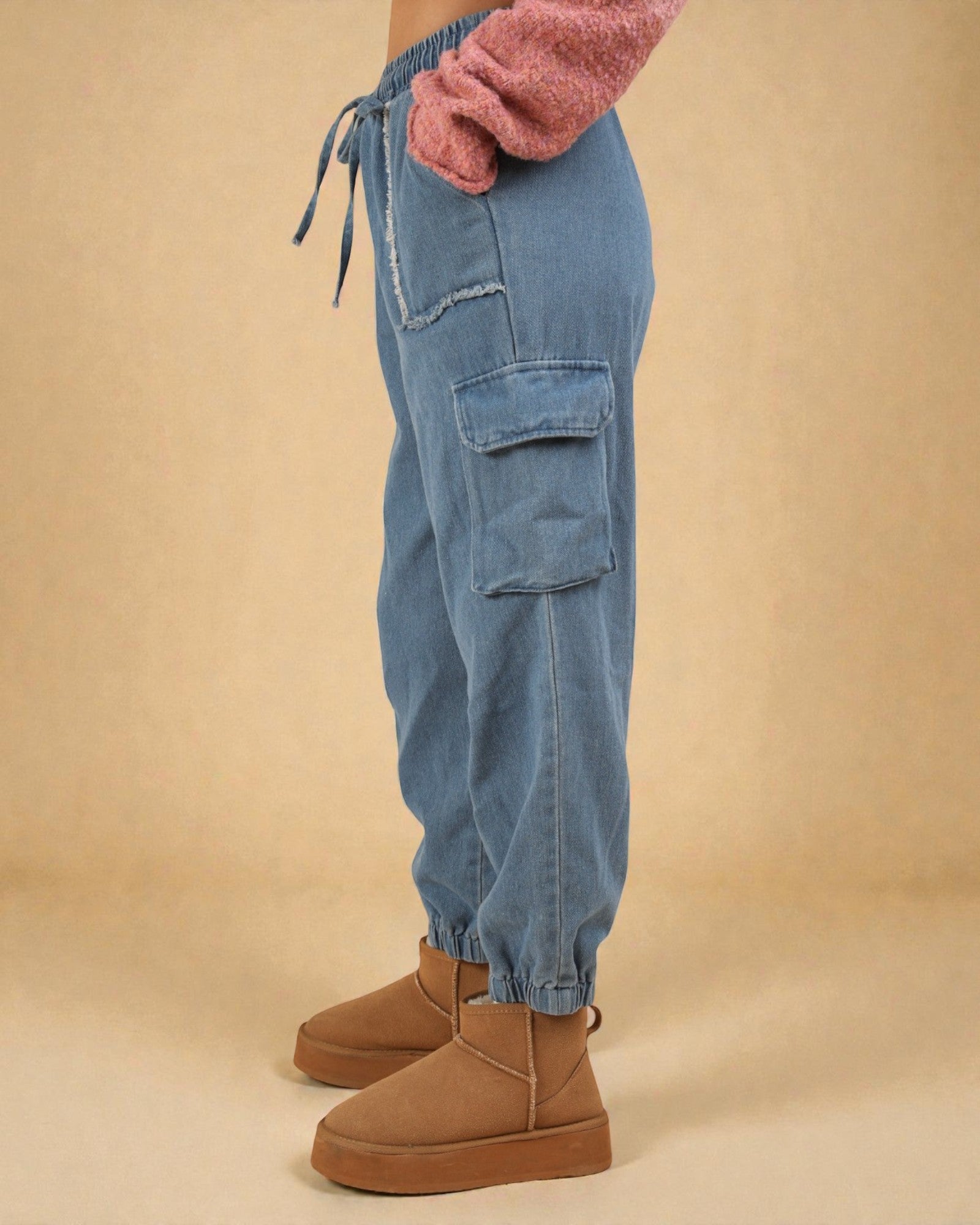 Presentamos nuestros pantalones de jogging cargo de mezclilla lavada. Estos pantalones de jogging están confeccionados con una suave mezcla de rayón y son cómodos y elegantes. La cintura con cordón permite un ajuste personalizado, lo que los convierte en la opción perfecta para cualquier ocasión informal. Pruébalos en el clásico índigo.