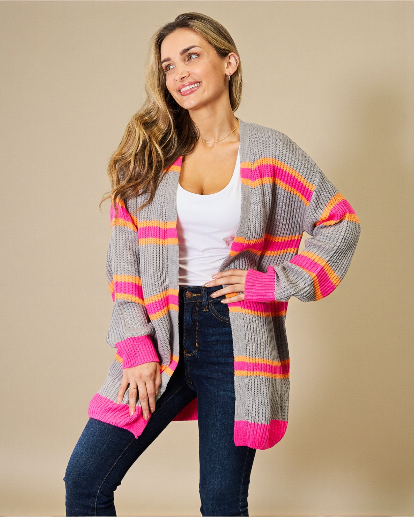 Libera a tu rebelde interior con este cárdigan de manga larga de punto acanalado. El diseño abierto al frente le da un toque especial al estilo clásico, mientras que la raya en contraste de color rosa intenso lo hace destacar. La silueta larga te dará un look elegante y con estilo.