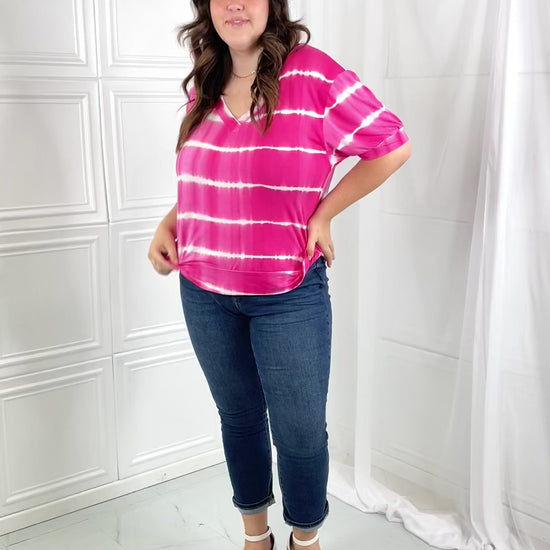 ¡Diviértete con nuestra blusa tie dye oversize! Este escote en V rosa intenso tiene mangas cortas y una mezcla de rayón para una máxima comodidad. Y con tallas inclusivas, todas pueden lucir este estilo divertido. ¡No te lo pierdas, hazte con tu prenda de la tendencia tie dye hoy mismo!