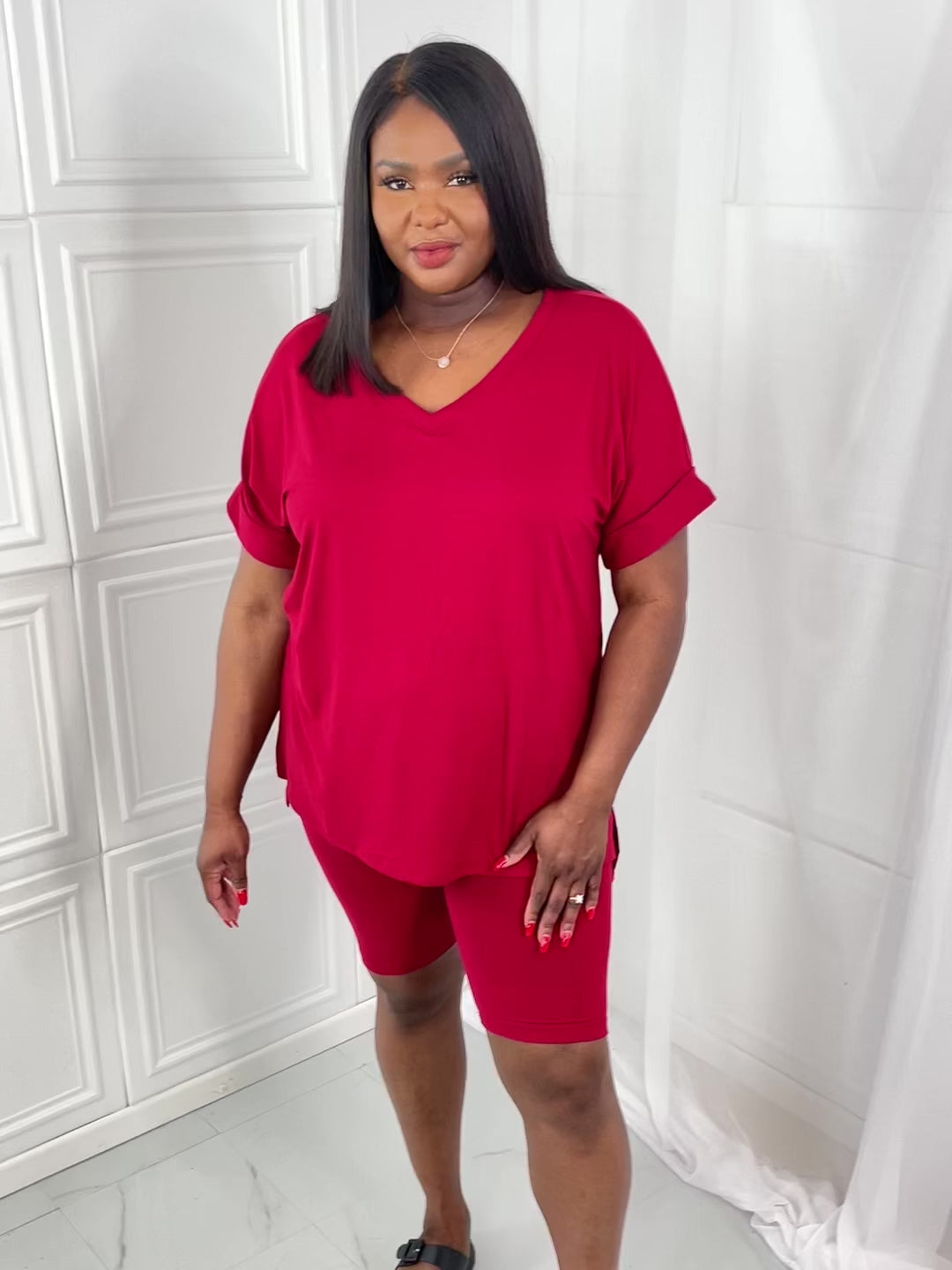 Este conjunto de dos piezas te hará sentir cómoda y elegante. Con una camiseta de cuello en V y pantalones cortos de ciclista confeccionados con una mezcla de rayón elástico, este conjunto ofrece un ajuste cómodo para todo tipo de cuerpos (¡incluso tallas!). Perfecto para un día de relajación o para hacer recados (o, seamos realistas, un día de Netflix y bocadillos).