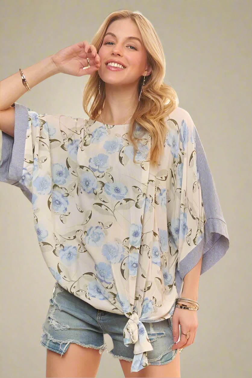 This playful floral blouse in blue and cream features charming half sleeves and a trendy tie-front design, perfect for adding a fresh, flirty touch to your wardrobe. Light and breezy, it’s ideal for sunny days and casual outings where style meets comfort.