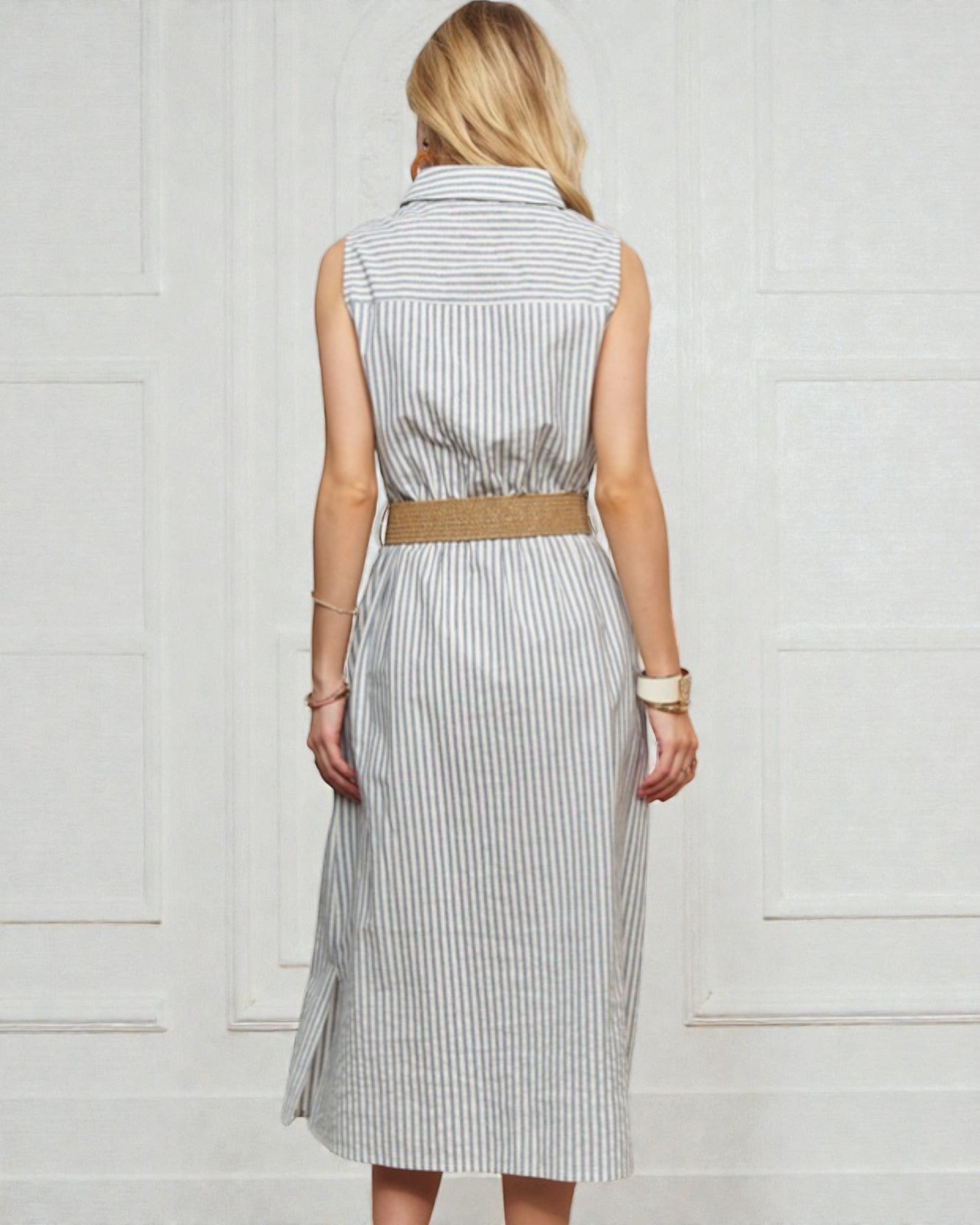 Effortless elegance meets laid-back charm in this striped midi dress. Crafted from a breathable cotton-linen blend, the sleeveless silhouette keeps you cool while the button-front design adds a touch of vintage-inspired appeal. The coordinating belt cinches at the waist for a flattering fit, and the ivory and slate stripes work with everything in your closet.
