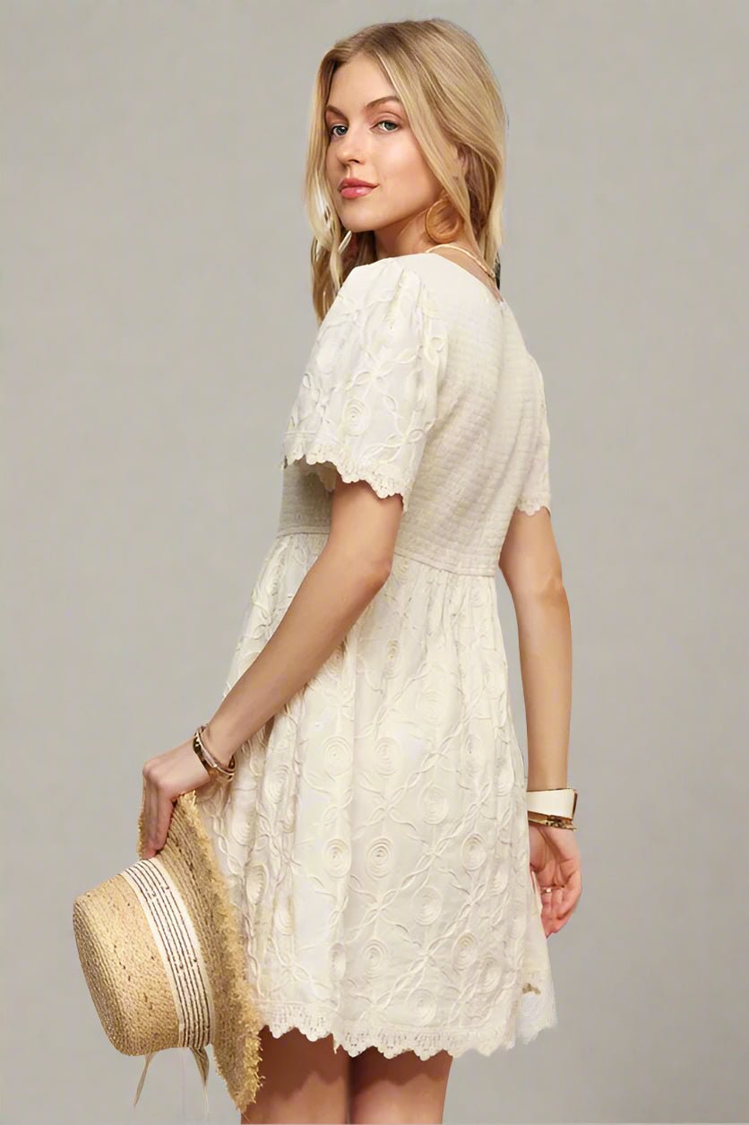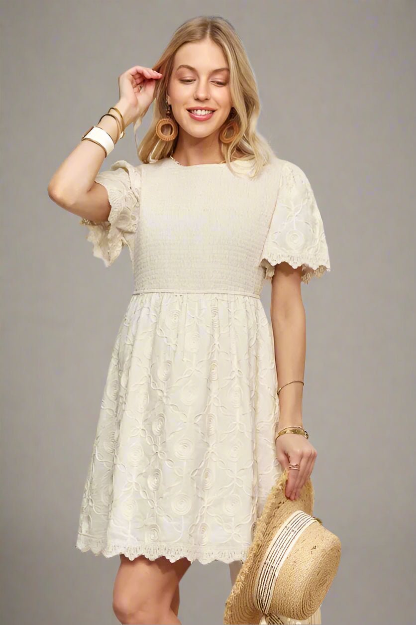 Step into sunshine with this Ivory Cream Lace Puff Sleeve Mini Dress! Crafted from soft cotton and fully lined for comfort, its short puff sleeves add a flirty, playful touch. Perfect for twirling through warm days, this dress blends delicate lace with easy-breezy style for a look that’s both sweet and spirited.