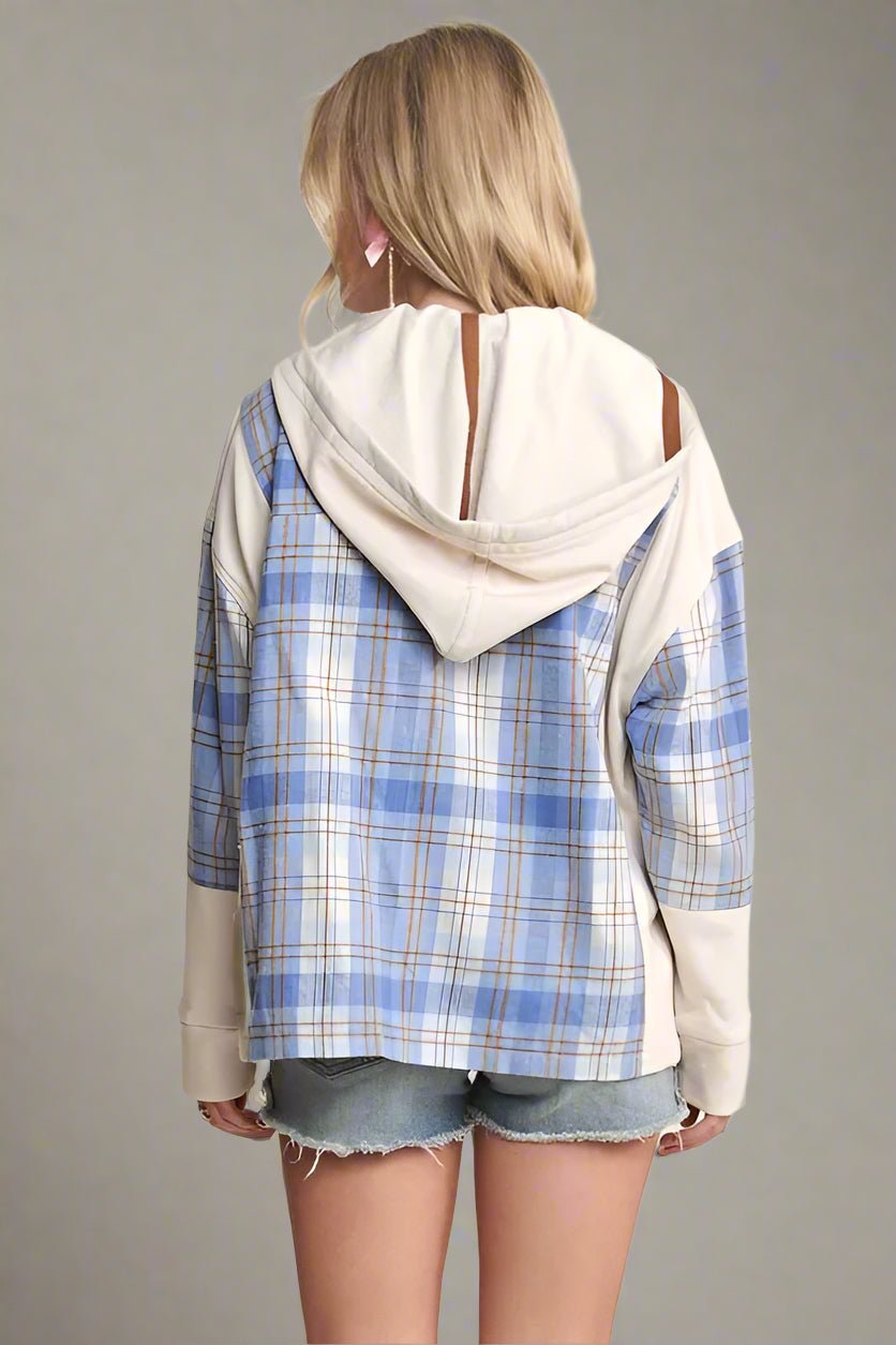 Plaid Hoodie Button-Up Jacket in Blue & Cream