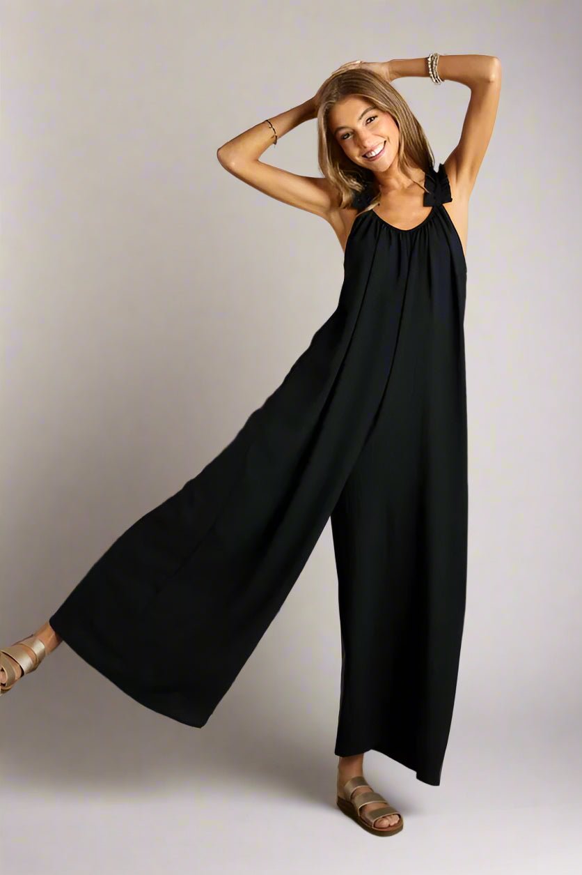 This playful Ruffle Strap Wide Leg Jumpsuit in Black Charcoal features an open tie back for a flirty touch and convenient pockets to keep your essentials close. Designed with comfort in mind, it’s available in plus sizes, making it a perfect fit for everyone who loves effortless style and a wide-leg silhouette that moves with you.