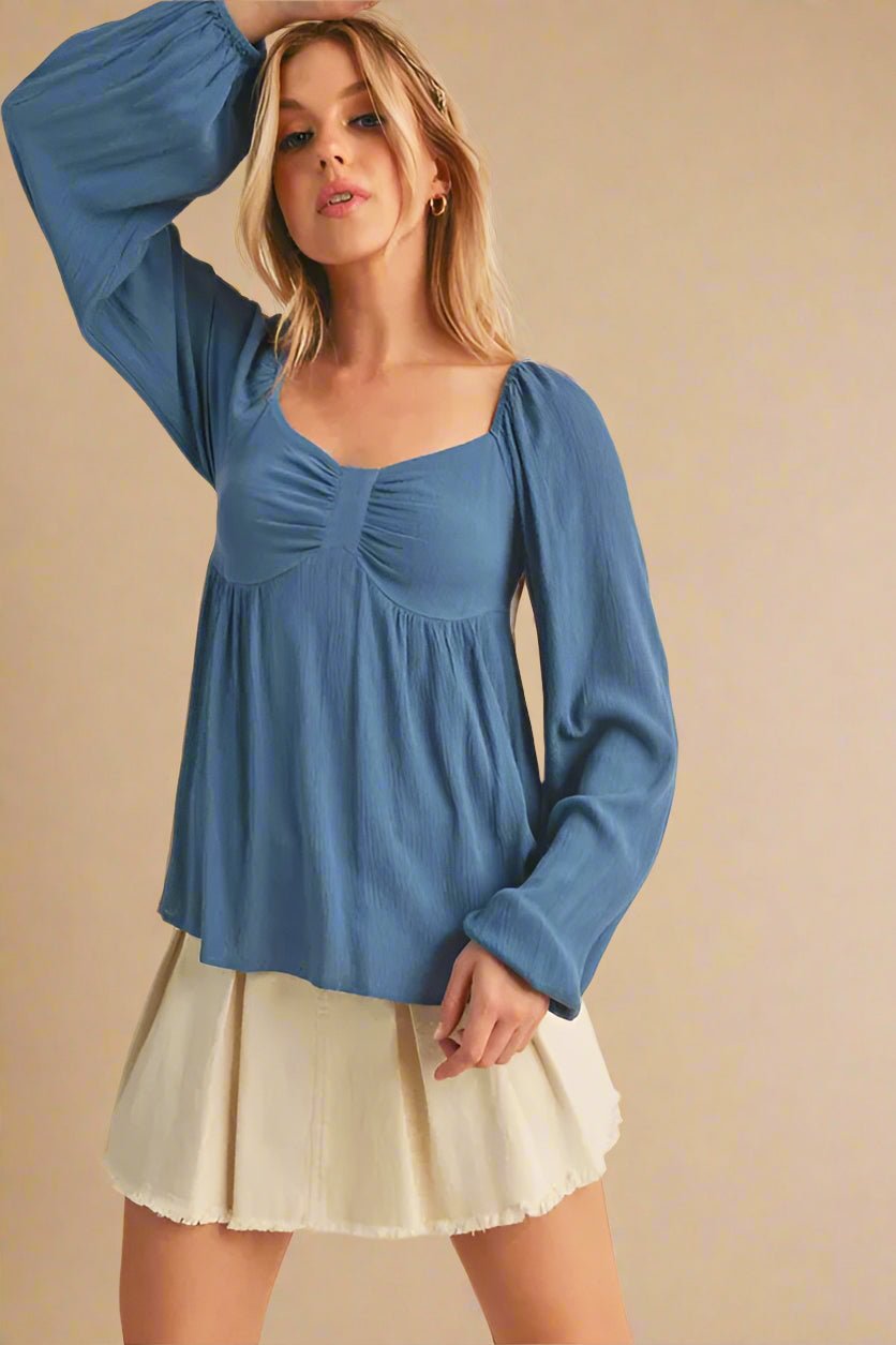 Sweetheart Ruched Babydoll Top in Slate Blue
