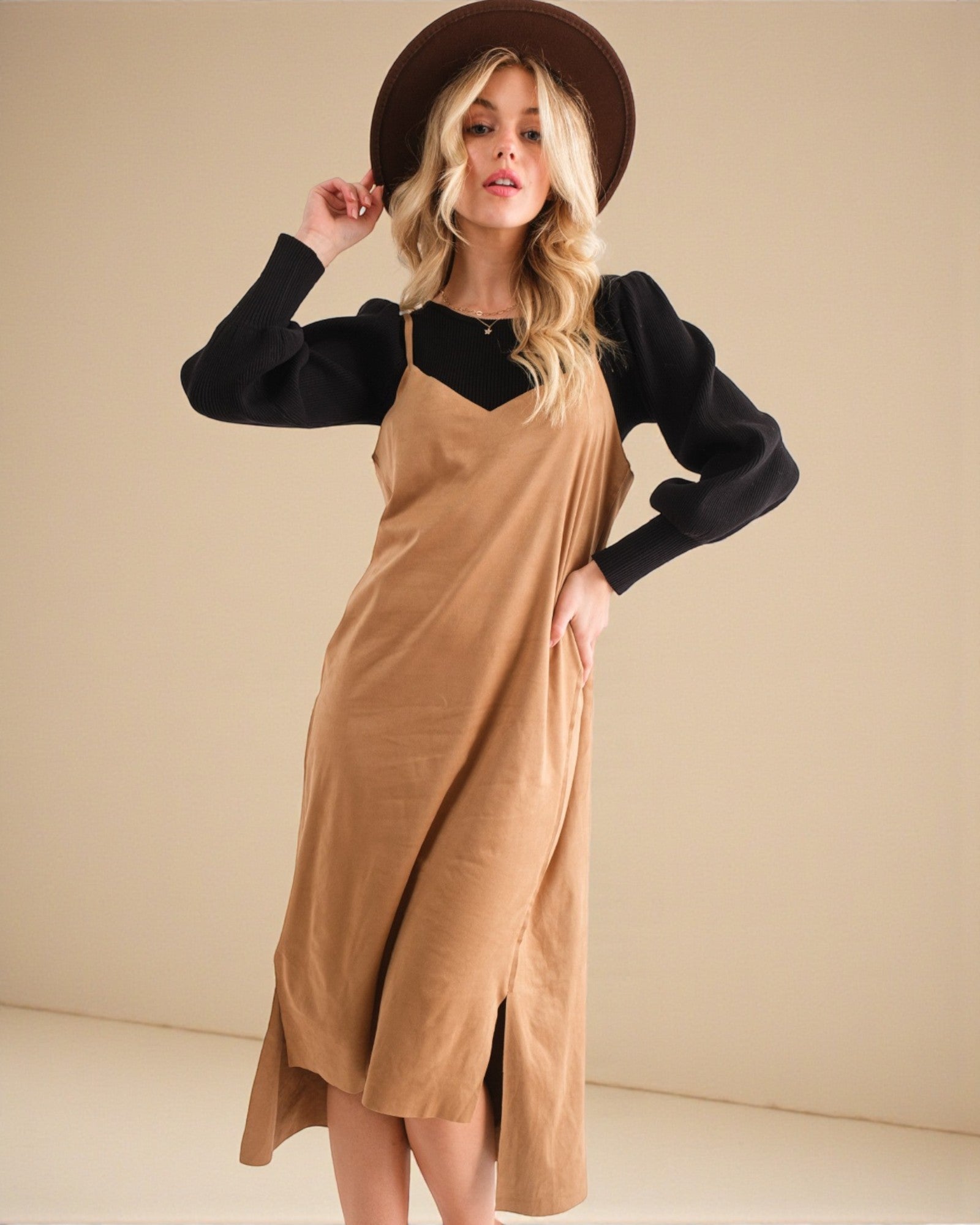 Découvrez un confort et un style ultimes avec notre robe camisole mi-longue à ourlet haut-bas en daim végétalien. Dotée d'un tissu extensible léger, cette robe est non seulement douce et lisse, mais bouge également avec votre corps pour un ajustement parfait. Améliorez votre style avec le mélange parfait de confort et de chic !