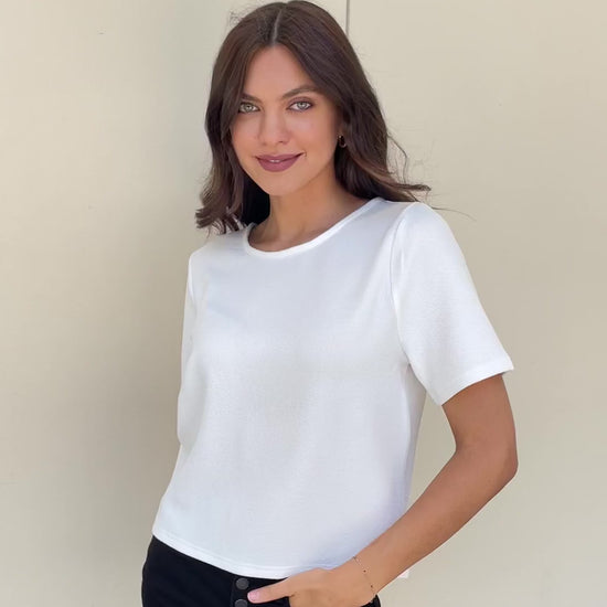 T-shirt dos nu à détails de perles et entrecroisées en blanc cassé