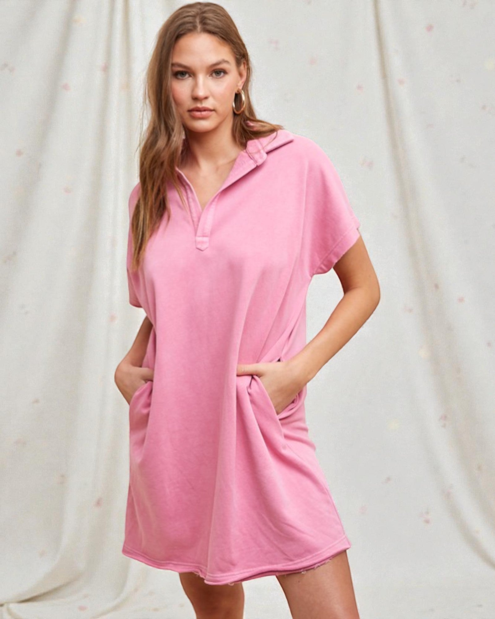 Effortlessly chic and ready for anything, this blush collared mini dress brings vintage charm with a modern twist. Soft mineral-washed fabric creates that perfectly lived-in feel, while crisp short sleeves and a classic collar keep things polished. The handy pocket adds both style and function—because pockets are always a win.