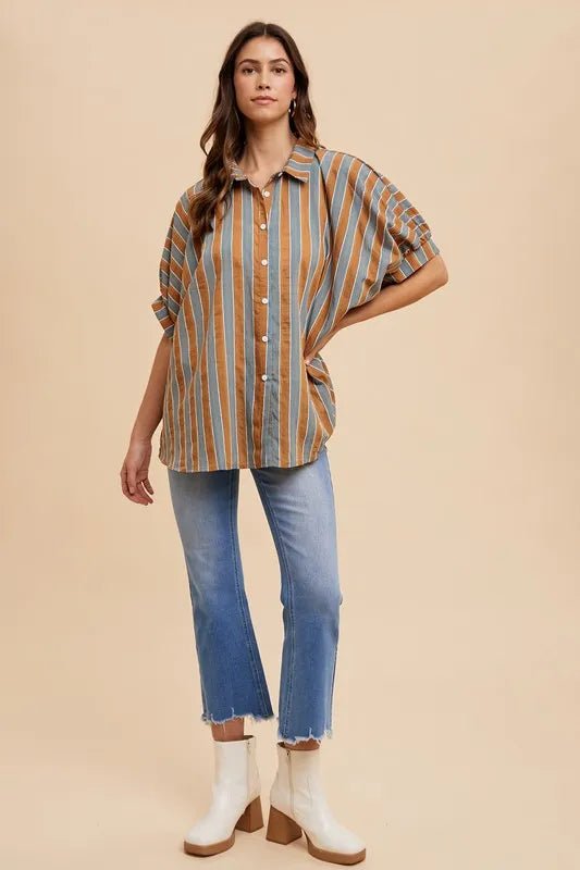Embrace effortless style with this oversized striped button-down shirt in warm rust and cool blue. Crafted from soft cotton, its short sleeves keep you comfy and breezy all day. Perfect for layering or wearing solo, this playful piece adds a splash of color and relaxed charm to any outfit.