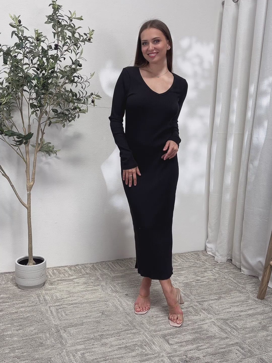 Préparez-vous à faire sensation avec cette robe midi à manches longues en tricot côtelé noir ! Fabriquée à partir d'un mélange de coton, cette robe offre un confort ultime et présente une encolure dégagée flatteuse. Avec une fente arrière ludique et disponible en grandes tailles, vous ferez tourner les têtes partout où vous irez.