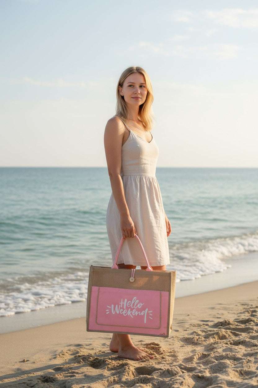 Préparez-vous pour le week-end avec notre sac fourre-tout en toile de jute Hello Weekend ! Parfait pour tous vos essentiels, ce grand fourre-tout est disponible en trois choix de couleurs amusantes. Dites bonjour à votre nouveau sac incontournable pour les aventures du week-end (et en semaine aussi) !