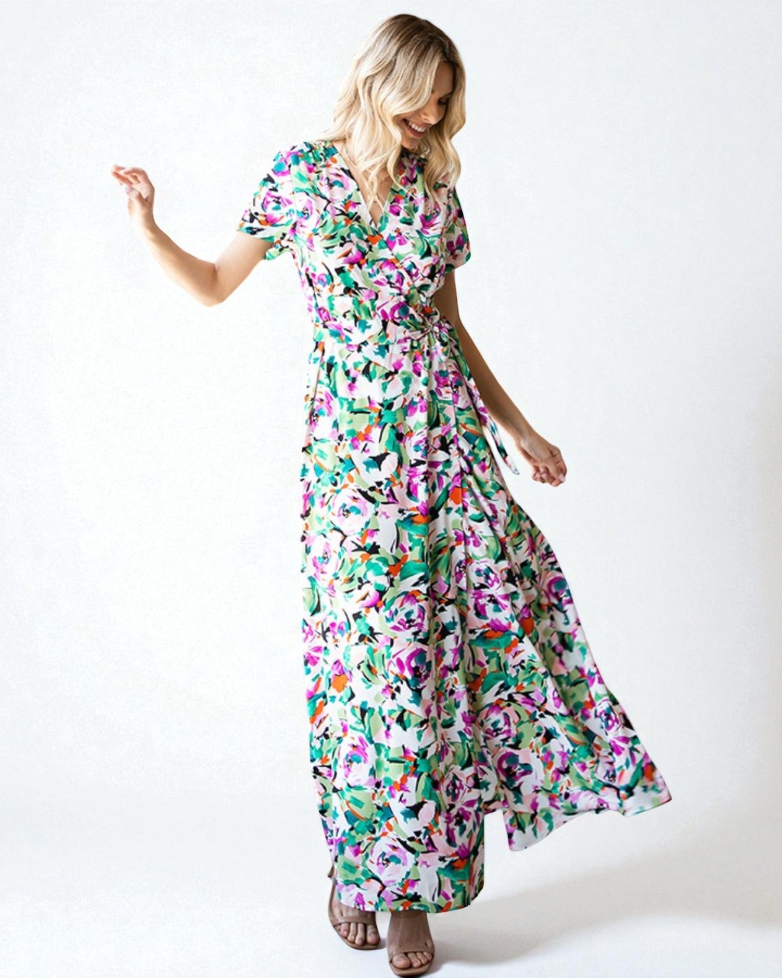 Robe portefeuille longue à manches courtes et imprimé multicolore