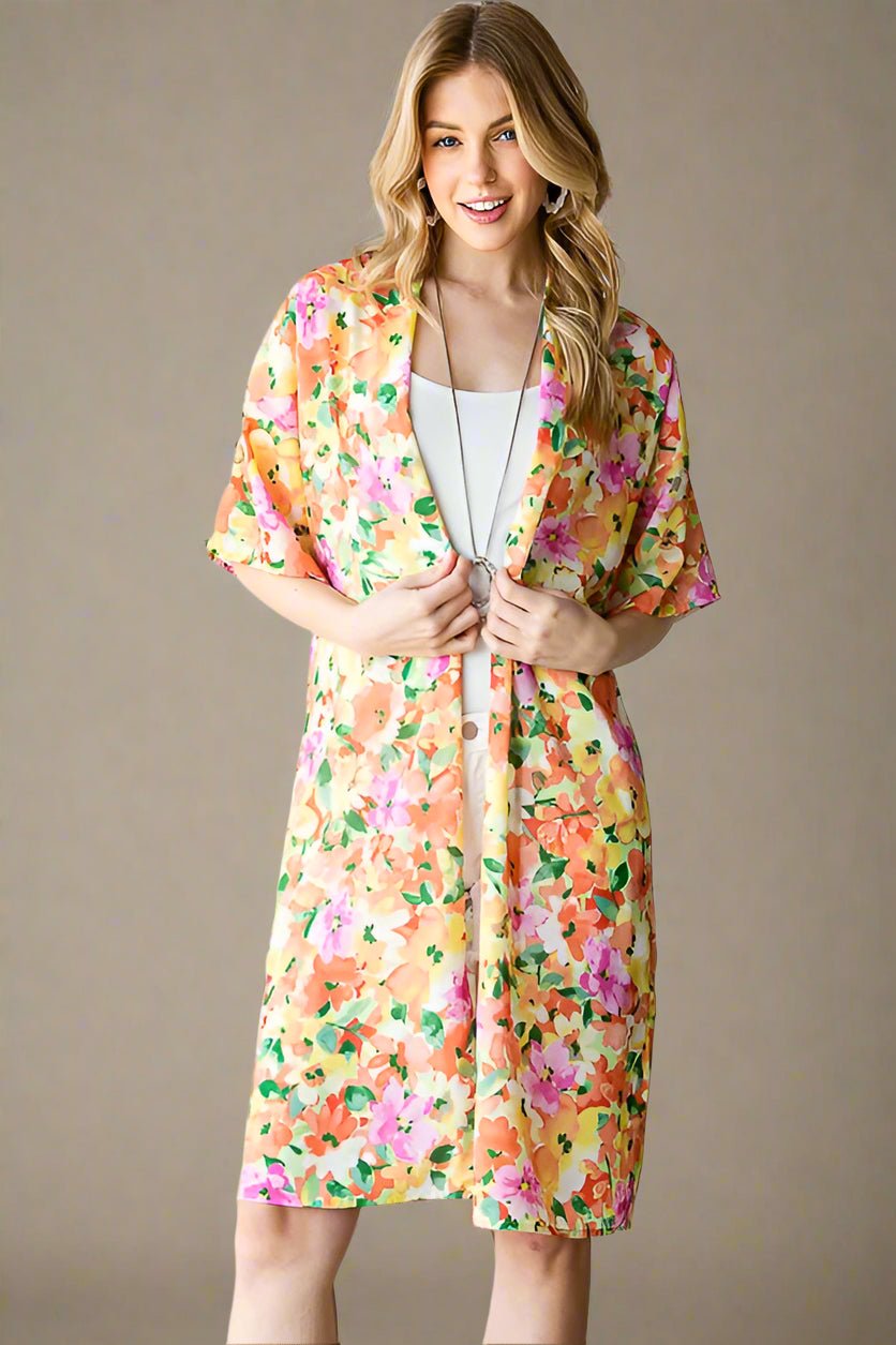 Add a pop of color to your outfit with our Half Sleeve Multicolor Floral Kimono Cover-Up! Lightweight and open front, this cover-up is perfect for any occasion. Plus sizes available for the perfect fit. Elevate your style with ease!
