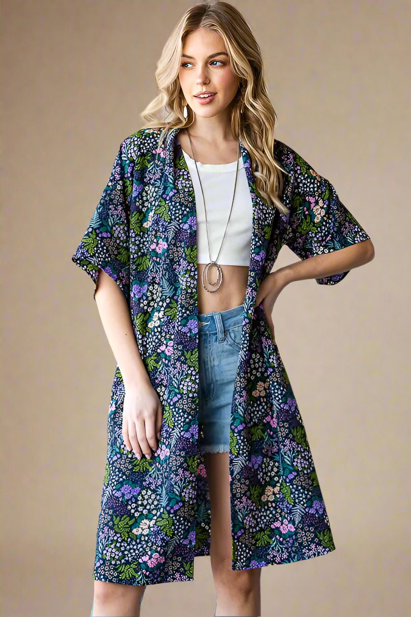 Unleash your inner flower power with this Navy Floral Half Sleeve Floral Kimono Cover-Up. Featuring an open front design and available in plus sizes, it's the perfect way to add a touch of boho chic to any outfit. Go ahead, embrace your wild side.