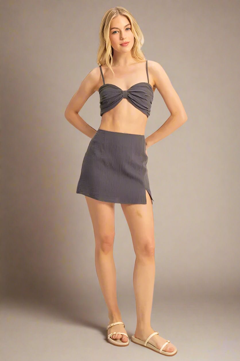 This Charcoal Textured Mini Skirt Set brings a flirty edge to your wardrobe with its sleek, modern design. The matching bralette top pairs perfectly with the mini skirt, creating a fun and confident look for sunny days or nights out. Lightweight and textured, this set offers comfort while turning heads wherever you go. Embrace playful style with this effortlessly chic duo!