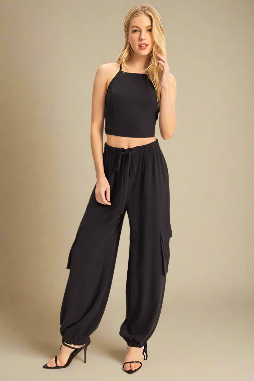 Turn heads and stay comfy with this playful black set featuring a flirty halter crop top and relaxed cargo joggers. Perfect for casual outings or lounging in style, the breathable fabric and trendy design keep you looking cool and feeling free all day long.