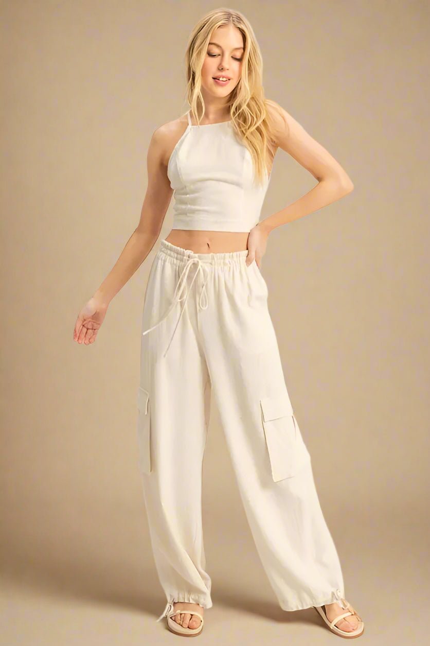 This playful Halter Crop Top & Cargo Joggers Set in Natural Sand features a comfy drawstring waist and cuffs for the perfect fit. Whether you're lounging or out on an adventure, this set keeps you stylish and relaxed all day long.