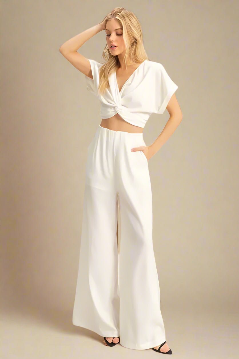 Get ready to twist and shout in this Ivory Twist Front Set! With its short sleeves and wide leg pants, this set is perfect for a casual and comfortable day out. Don't just take our word for it, try it on and feel the twist!