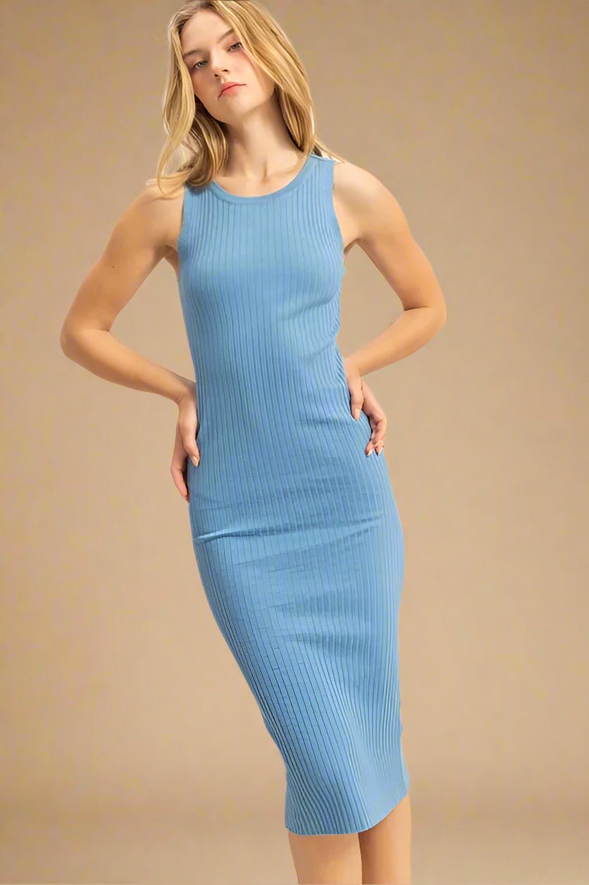 Step out in style with this playful light denim blue ribbed midi dress. With a sleeveless design, you'll stay cool and comfortable while turning heads wherever you go. Perfect for a day out with friends or a casual date night, this dress is a must-have addition to your wardrobe!