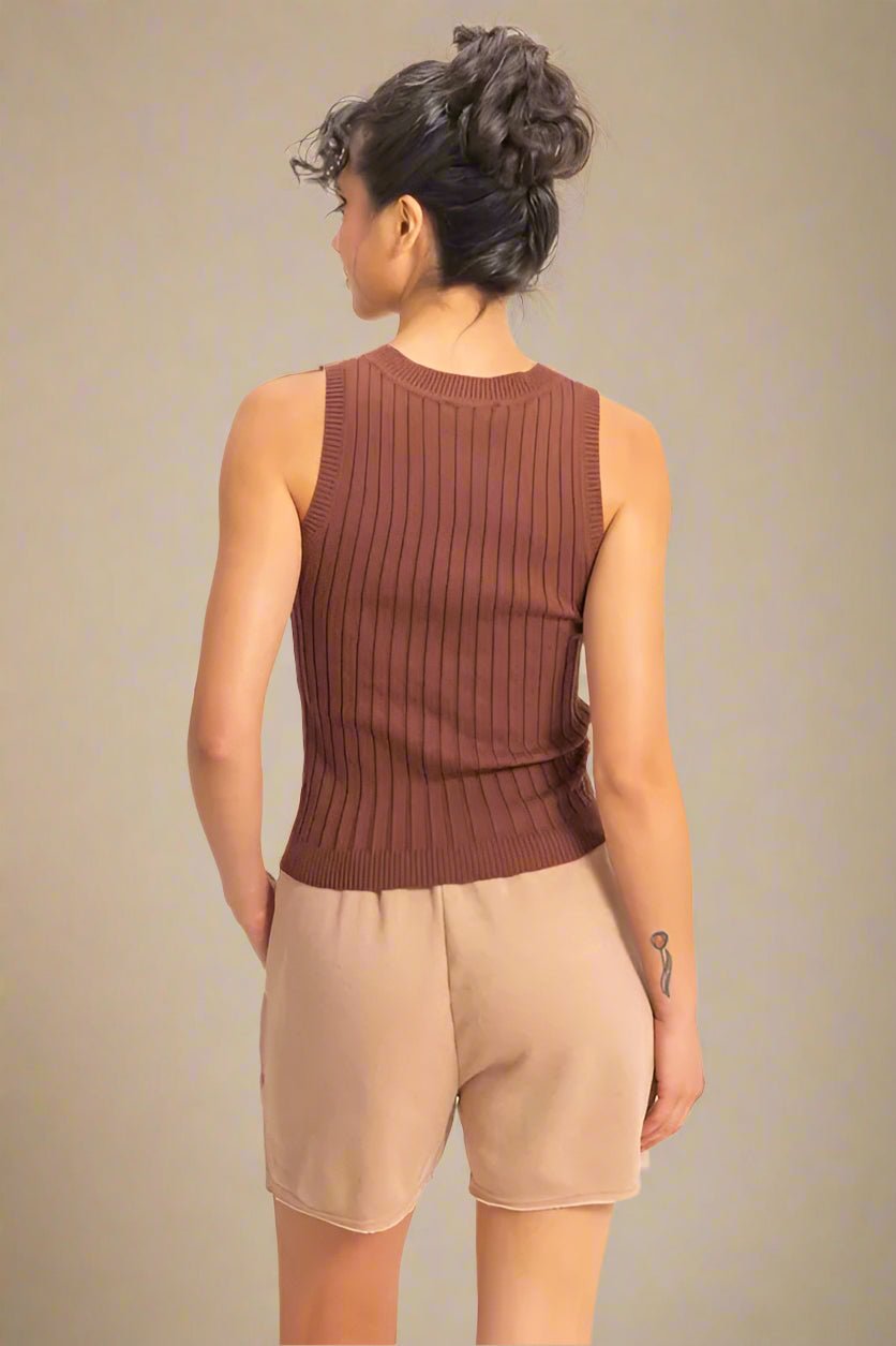 This cocoa brown tank is ribbed-knit for superior comfort and coolness. Keep it playful with the unique texture and rich colorway. Perfect for casual days or dress it up for an effortlessly chic look.