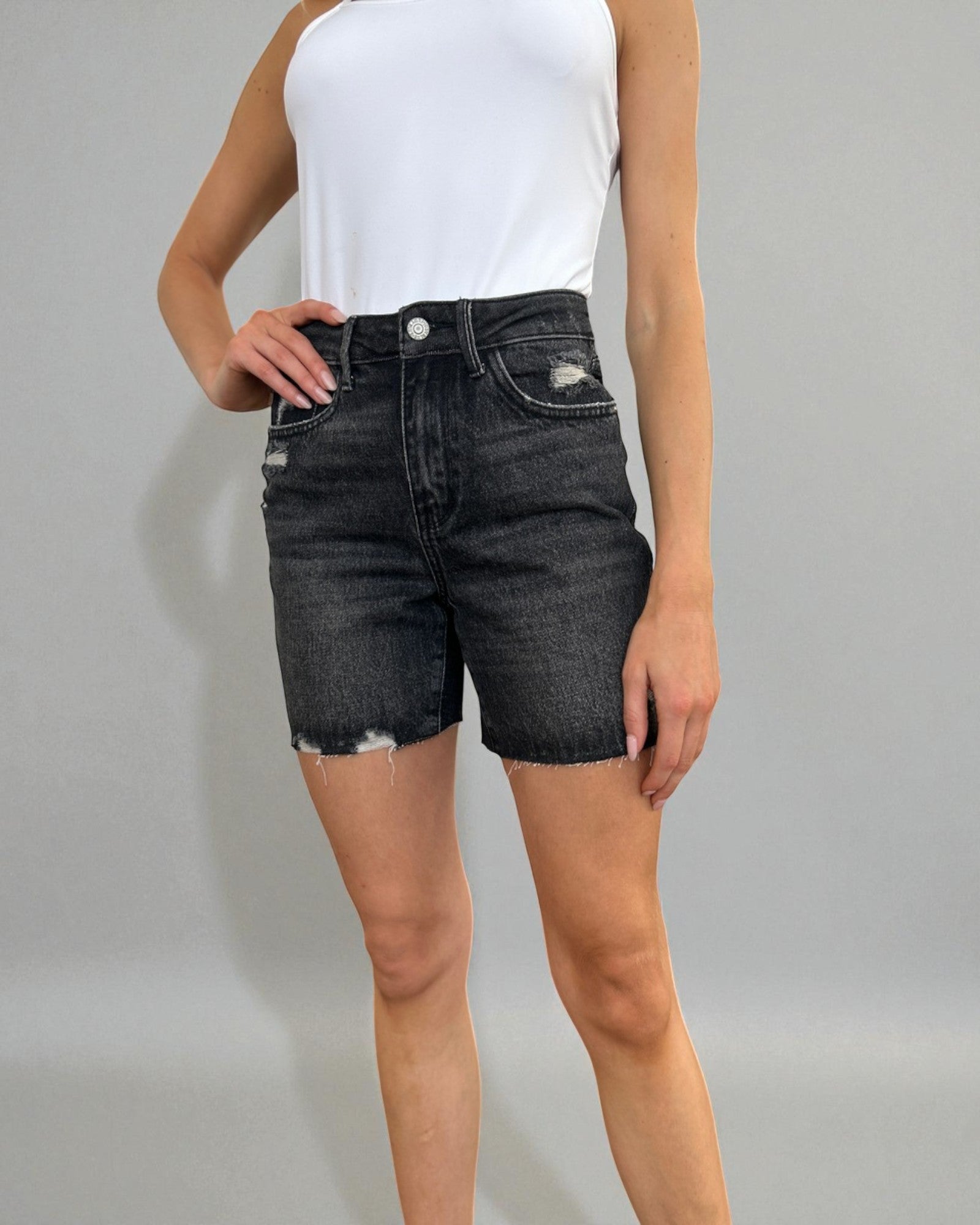 Short en jean taille haute noir délavé avec contrôle du ventre