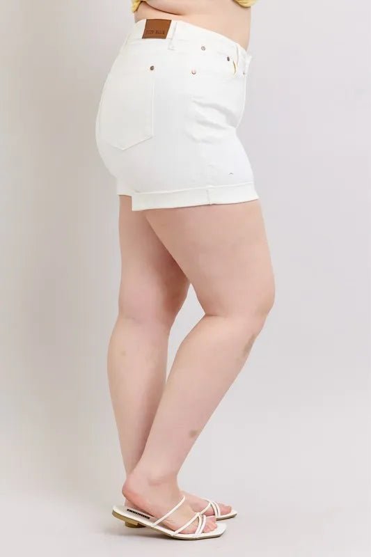 These High Rise Cuffed Denim Shorts in a clean white wash offer a perfect blend of comfort and style. Made from a soft cotton blend with a touch of stretch, they move with you all day long. Designed to flatter every figure, plus sizes are available so everyone can rock this fresh, playful look. Ideal for sunny days and casual outings, these shorts bring a bright, breezy vibe to your wardrobe.